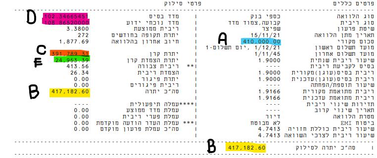 אדם לקח 410 אש"ח (הסימון הכחול -מסומן כA) בהלוואה בריבית קבועה הצמודה למדד ב15/11/2021 ובהחזר ראשוני של 1773 ש"ח. ההלוואה נושאת ריבית שנתית של 1.9%. הלקוח נדהם לגלות, 16 חודשים לאחר מכן, שעל אף שההחזר החודשי שלו עלה ב100 שקלים/חודש ביחס להחזר המקורי, יתרת החוב הנוכחית שלו היא 417182 ש"ח (הסימון הצהוב - B), כלומר 7182 ש"ח יותר ממה שלקח בפועל.