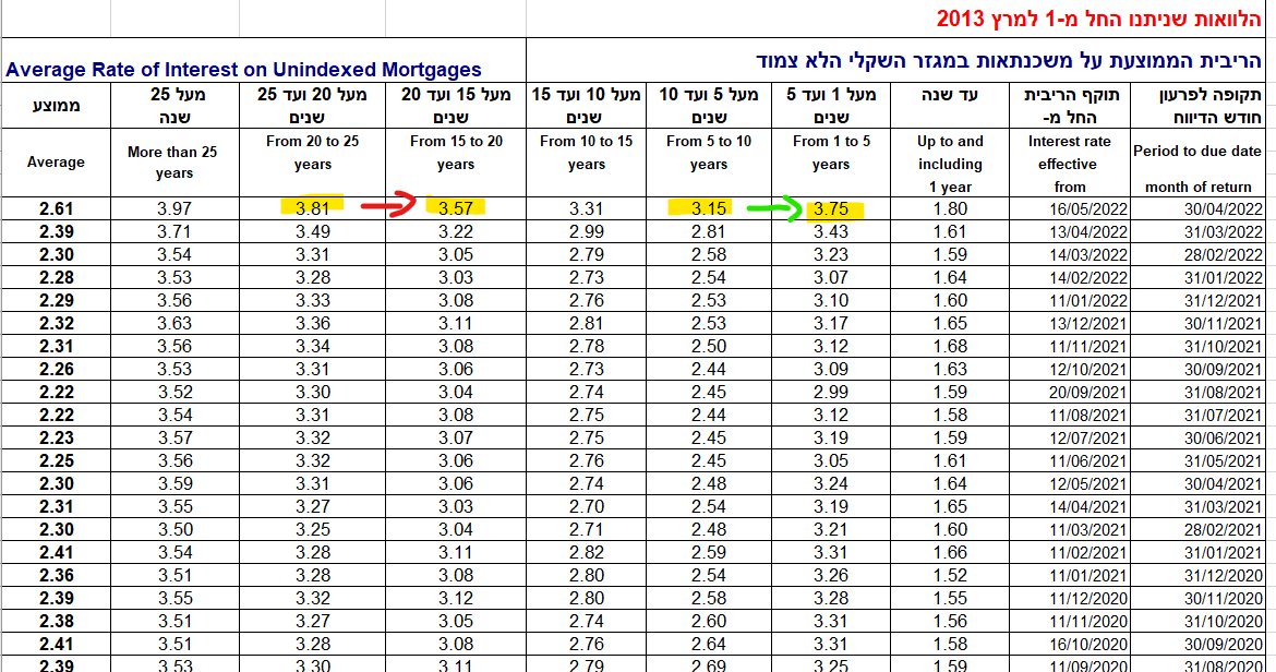 מכיוון שהריבית הממוצעת, במועד לקיחת המשכנתא (3.13%) נמוכה מהריבית על ההלוואה שלקחנו (3.55%) אז נעזר בריבית הממוצעת במועד לקיחת המשכנתא.