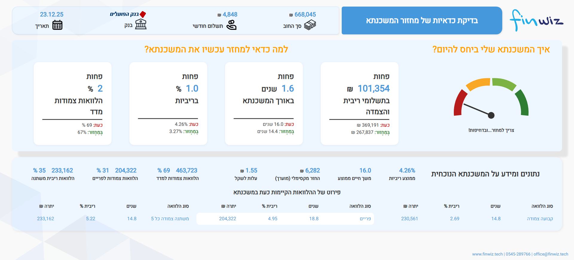 במקום להסתבך ולפרש את הנתונים בעצמכם (כפי שנתאר בשתי השיטות הבאות), אתם יכולים פשוט לתת לנו לעשות את העבודה. אתם מוזמנים להוריד מאתר הבנק דו"ח יתרה לסילוק, ולהגיש אותו לניתוח דרך המערכת שלנו. אתם תקבלו במהירות ניתוח של המצב הקיים, ומה ניתן להשיג/לשפר באותו החזר ורמת סיכון. לחלופין, אתם יכולים להתחיל בניסיון עצמאי עם מחשבון המשכנתא שלנו כדי לבנות תמהיל חדש לפני המיחזור.