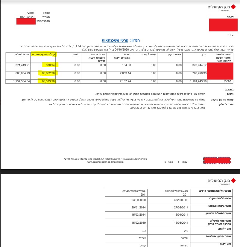 צירפנו דוגמה לדוח כזה מבנק הפועלים. בעמוד הראשון של הדוח, מתוארות כלל ההלוואות במשכנתא, ועבור כל הלוואה מצוין גובה עמלת הפירעון מוקדם שלה.