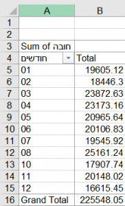ייפתח לכם Sheet (גיליון) חדש שבו תגדירו את ה Pivot table. גררו את שדה "חודש" לקבוצת השורות ואת שדה חובה לקבוצת הערכים. ודאו שבחרתם "Sum" בקבוצת הערכים (בדרך כלל ברירת המחדל היא Count).