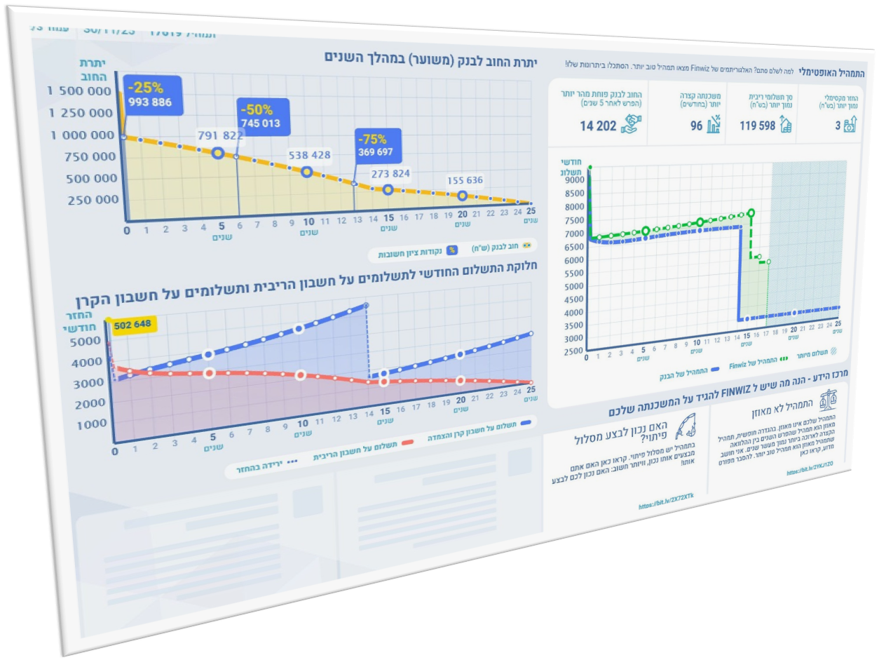 פנינו לאייל מ finwiz לצורך ליווי בתהליך קבלת משכנתא. לאורך כל התהליך קיבלנו זמינות מלאה +, הסברים ברורים ומענה לכל השאלות. בסופו של דבר, למדנו המון, וקיבלנו משכנתא שמותאמת בדיוק לצרכינו